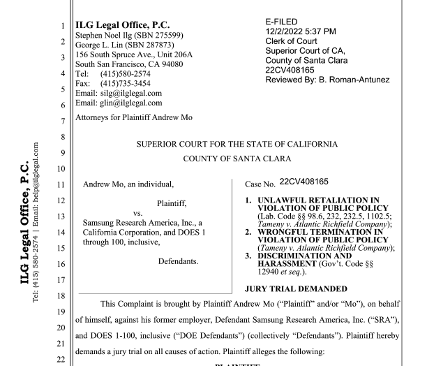 According to the complaint, on the morning of January 19, 2022, the plaintiff received an email from Sanchita Gupta, the SRA Director of Human Resources, stating that his employment with Samsung would be terminated effective immediately. Mo’s termination was without cause, and Gupta cited “role elimination” as the reason for termination.