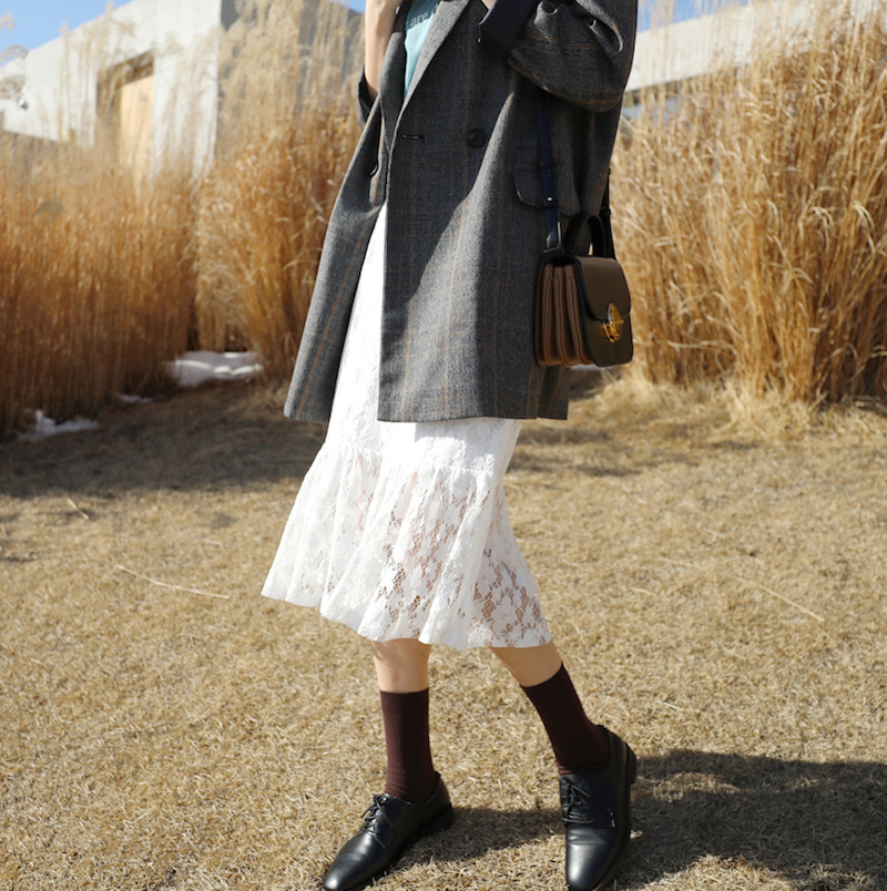The see-through lace patterns are also popular, especially in white or black color. On streets in Seoul, you can frequently spot people wearing matching lace top and long skirt like a dress