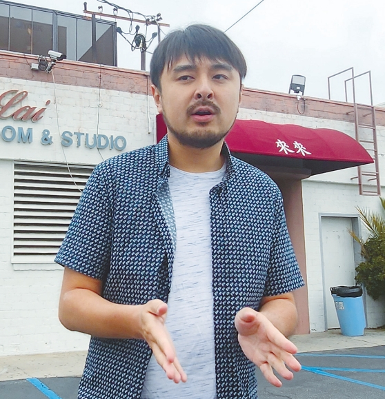 Brandon Tsay, who emerged as a national hero in January after fearlessly subduing a gunman on New Year’s Eve, stands outside his family’s dance studio, Lai Lai Dance Studio, in Alhambra on June 5. The backdrop of the photograph showcases the lobby area, characterized by a red awning, where the confrontation unfolded. [Inseong Choi, The Korea Daily]