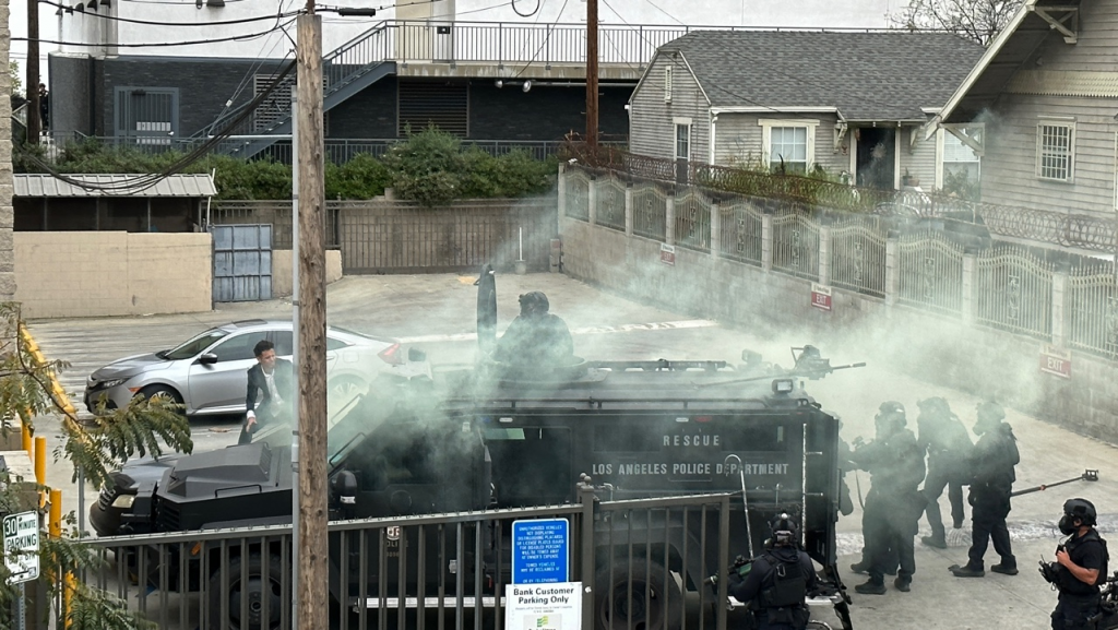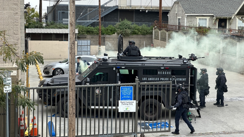 Los Angeles police officers engaged on April 13 in a standoff with a robbery suspect who attempted to rob a Bank of Hope branch at Olympic and Vermont in Koreatown.
