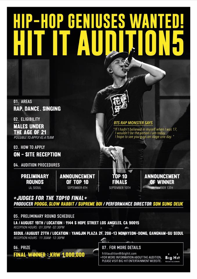To continue its fame, Big Hit is holding an open audient both in Seoul and Los Angeles. The Los Angeles audition will be held on August 19 at a dance studio located in Downtown Los Angeles (1144 S Hope St). Applicants can register on-site between 1:30 PM and 2:30 PM on the audition day.