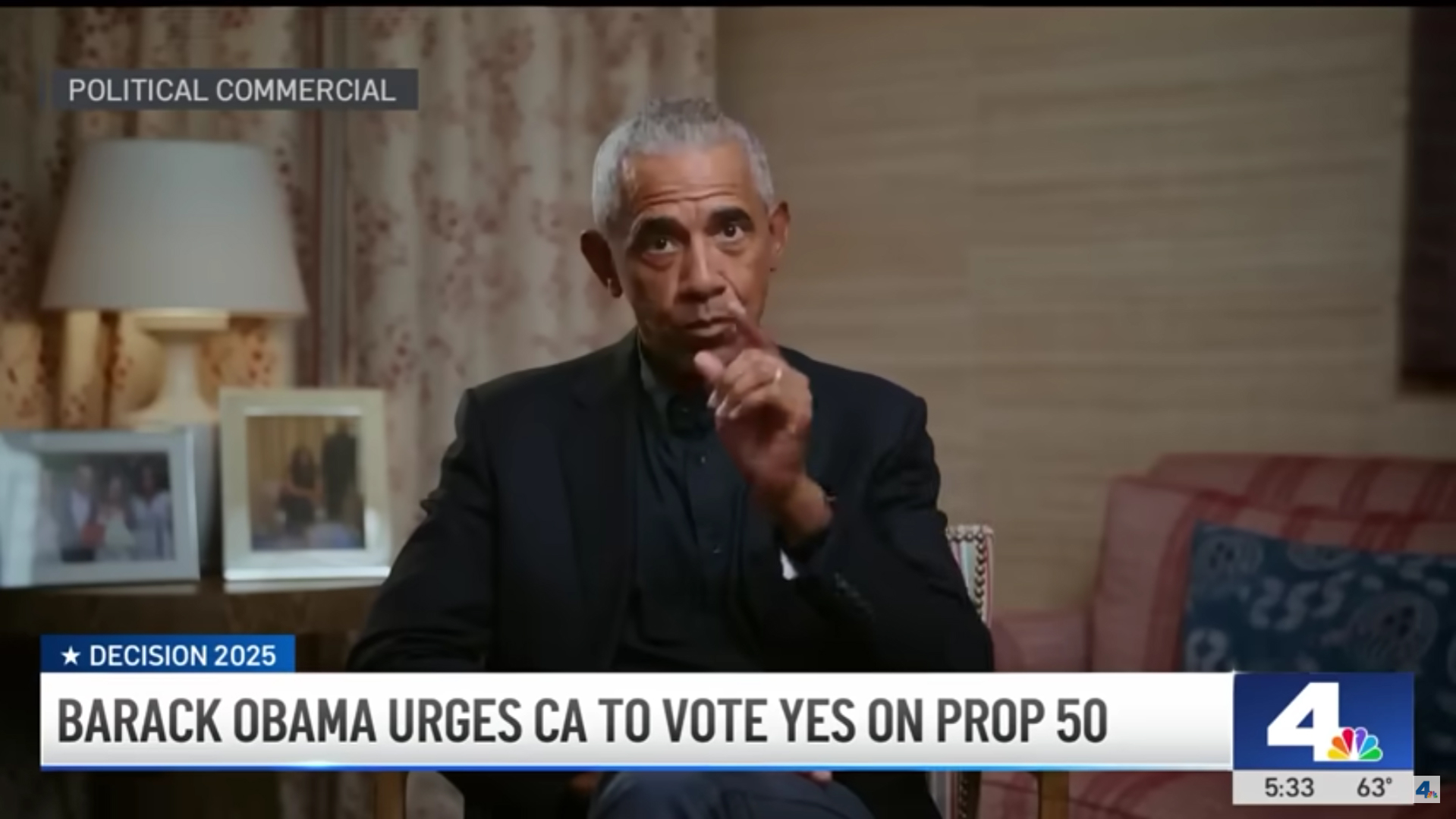 Former President Barack Obama appears in a new NBC Los Angeles campaign ad urging Californians to vote “Yes” on Proposition 50. Screenshot from NBC Los Angeles broadcast.