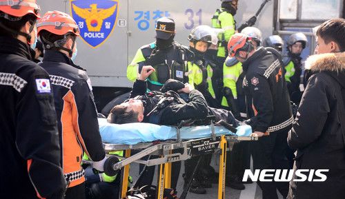 Kim (72) fainted after his head was hit by a large dual speaker that Jung (65) had dropped, but could not survive despite being sent to hospital. Jung had seized the police bus and drove it but during that process a large dual speaker that was on top of another police car fell, hitting Kim’s head. Jung was arrested afterwards.