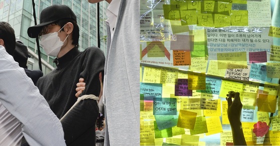 The suspect of ‘Gangnam murder case’ (left) and notes left to pay respect to the victim [JoongAng Photo].