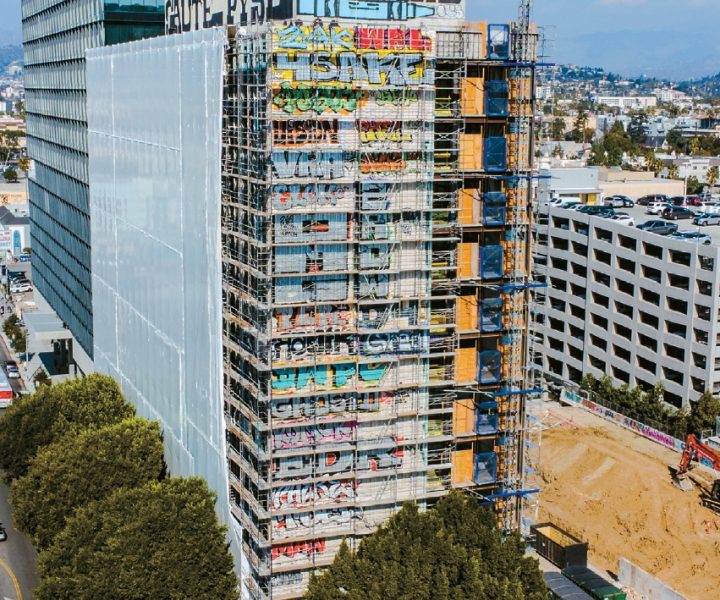 A high-rise building in Los Angeles Koreatown has been vandalized with extensive graffiti.