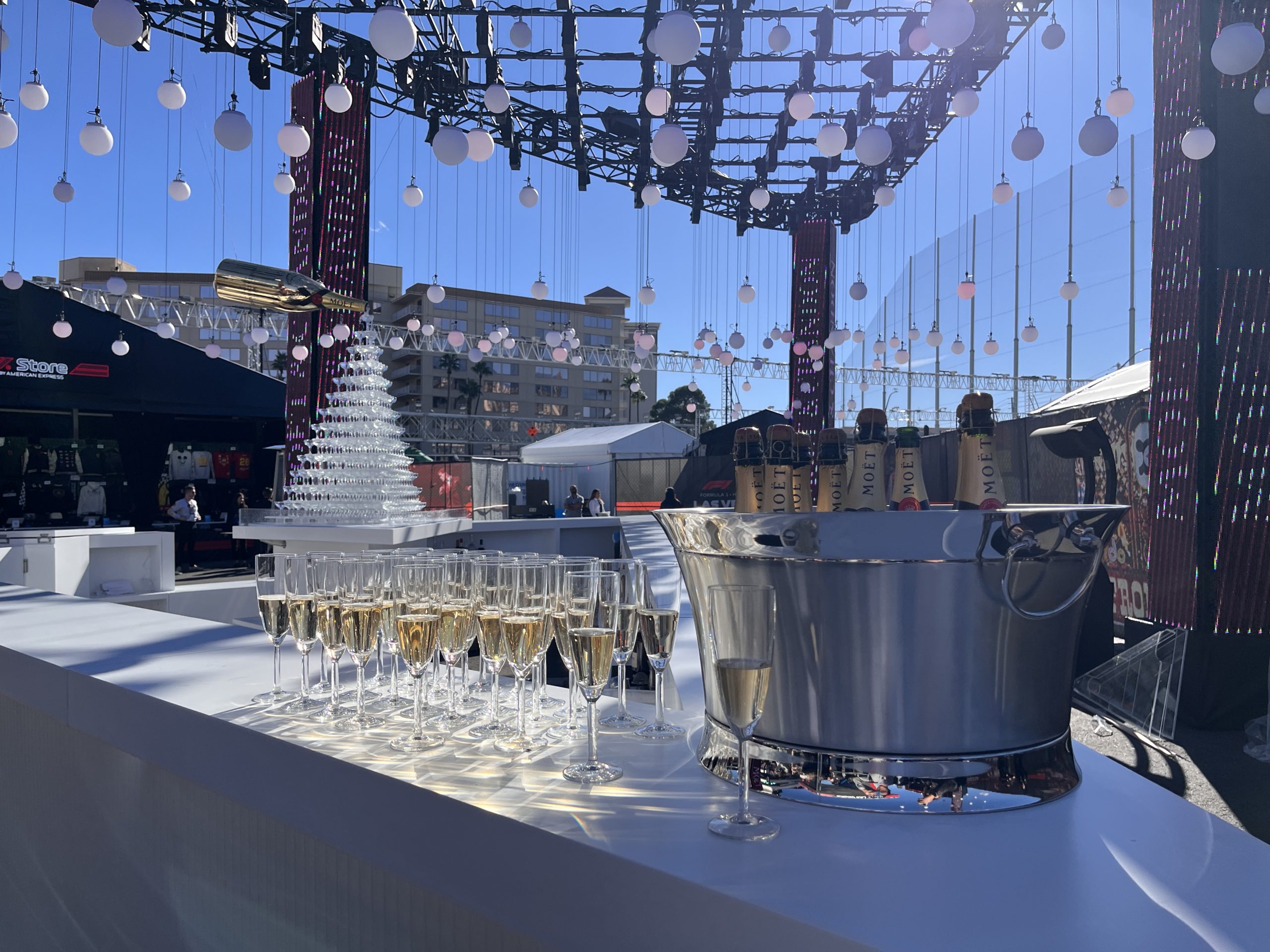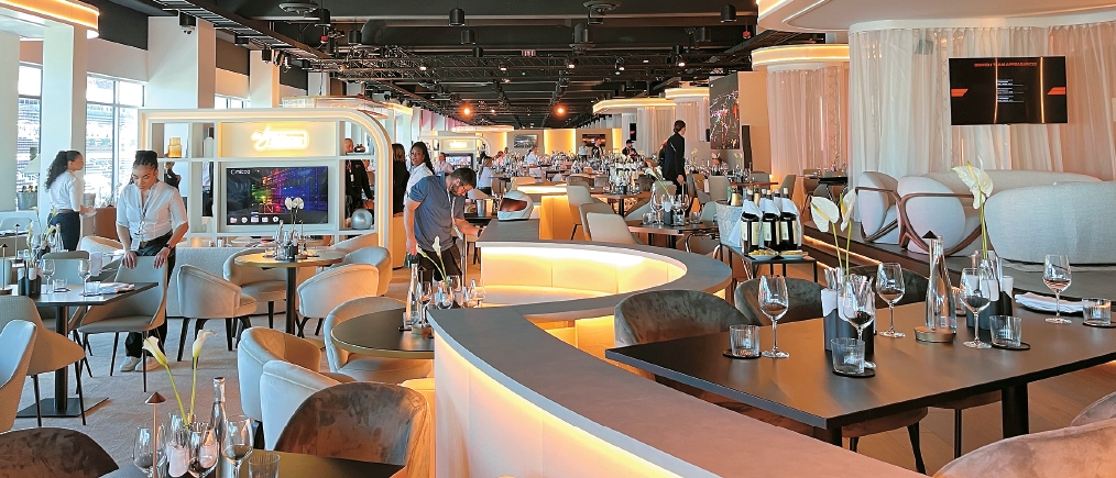 Often described as the pinnacle of sports hospitality, the Paddock Club delivers a full sensory experience. At the entrance, guests are greeted with complimentary champagne from Moët & Chandon, an official F1 partner. A dedicated champagne bar operates throughout the Grand Prix. “It’s the same champagne used on the podium for the victory celebration,” said Fallon Porter, communications manager for the Las Vegas Grand Prix, “and every Paddock Club guest can enjoy it.”