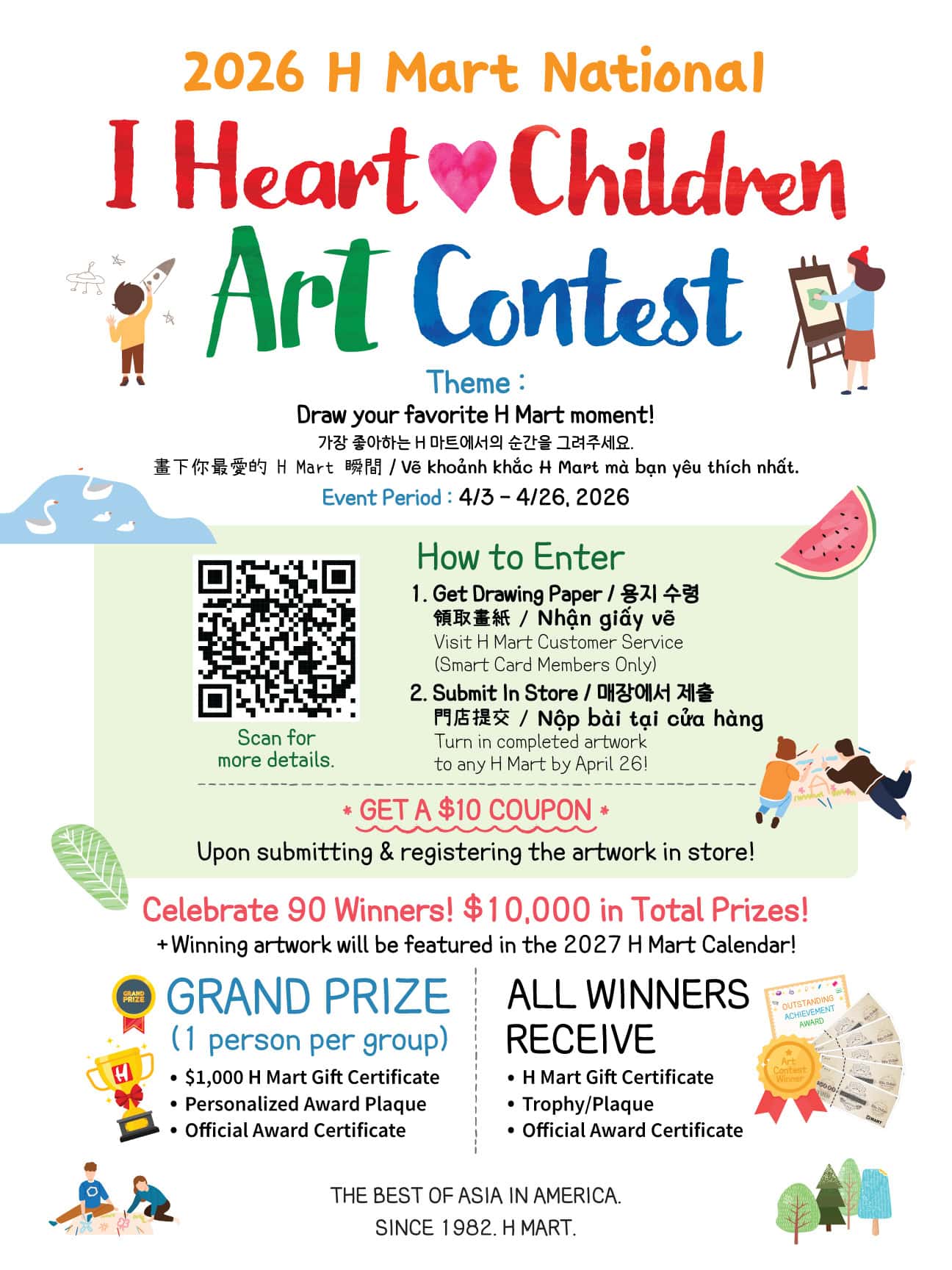 Starting April 3rd through April 26th, young artists from Pre-K to 5th grade can showcase their talent. Participation is exclusive to H Mart Smart Reward Card members, making it a perfect time to join the club if you haven’t already.