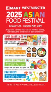 H Mart Asian Food Festival will run from October 17 to 26 at the H Mart Westminster(16450 Beach Blvd.) location in Orange County. The 10-day celebration by the nation’s largest Asian supermarket chain will highlight diverse Asian cuisines and cultures through free tastings, traditional performances, and family-friendly activities. An official event poster is available on H Mart’s website.