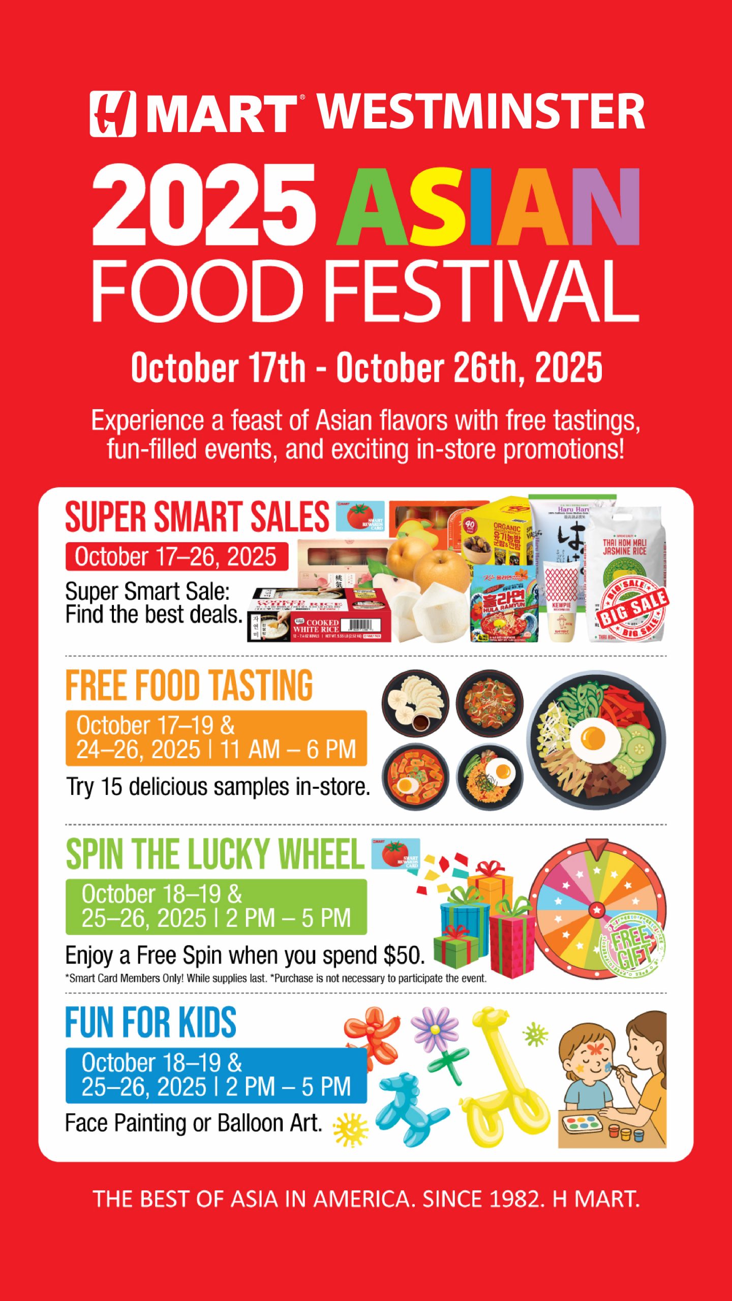 During the festival, H Mart Smart Card members can enjoy special discounts on popular Asian food products. Free tasting sessions will be held from 11 a.m. to 6 p.m. on the weekends of October 17–19 and October 24–26, featuring signature dishes from Korea, Japan, Vietnam, Thailand, and other Asian countries.