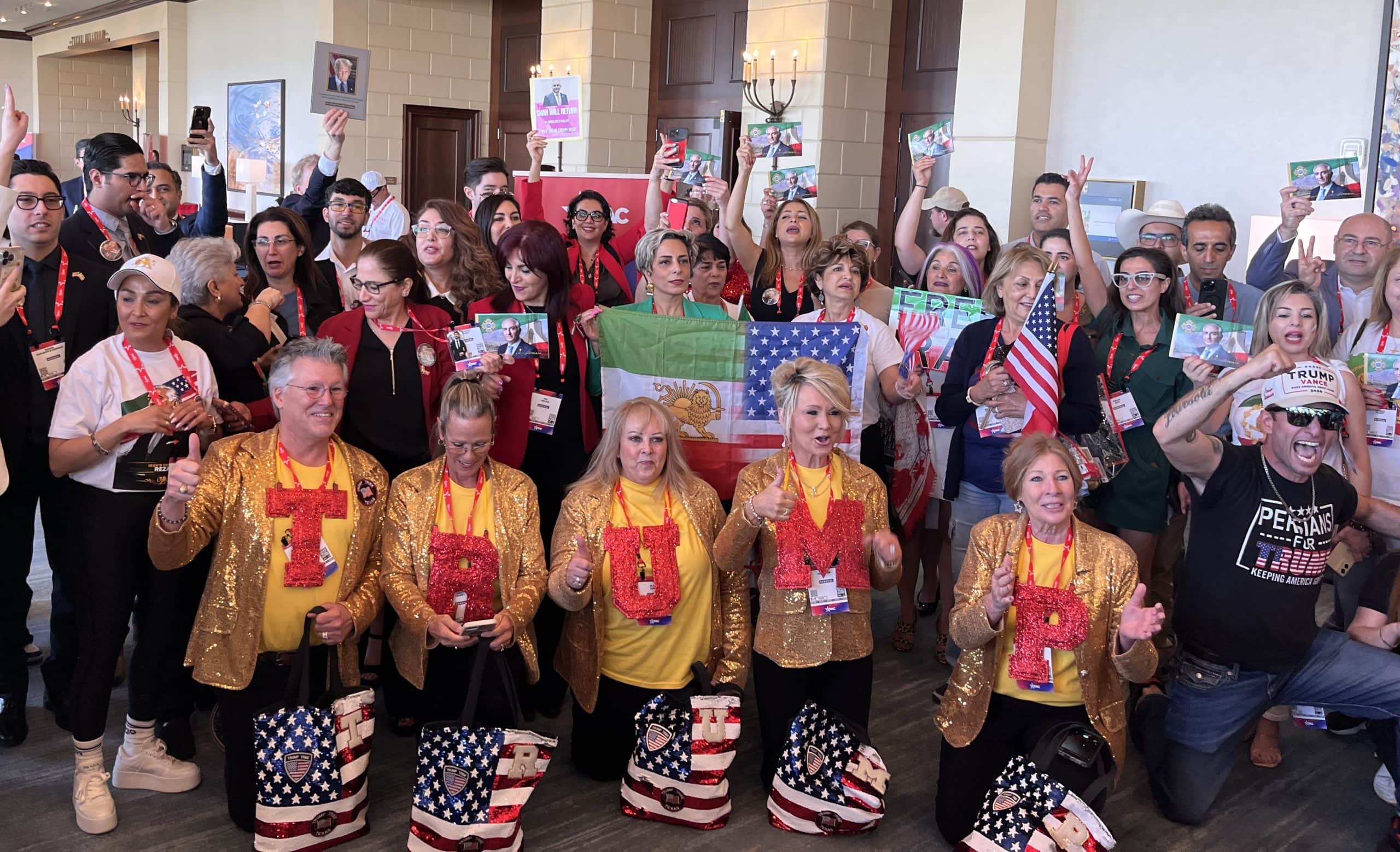 Iranian American CPAC participants and Trump supporters chanting for Iran regime change in hallway outside event venue