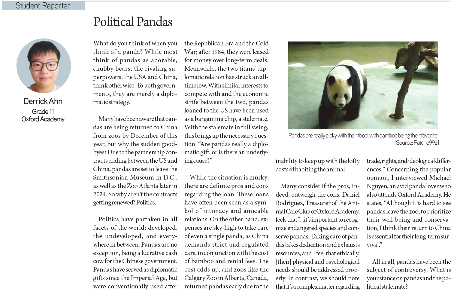 [KD Student Reporters] Political Pandas (by Derrick Ahn) By Korea Daily Digital Oct 18, 2023 2:57 PM PDT Newspaper PDF Download ▶Zoom in on the article image on click. The Breakthroughs and Caveats of AI (by Jeremiah Chun) Jeremiah Chun / Grade 12 / West Ranch High School 50th Korean Traditional Music Institute Anniversary Event (by Dion Jung) Dion Jung / Grade 12 / Larchmont Charter School The Importance of Sunscreen (by Anthony Park) Anthony Park / Grade 10 / Northwood High School The Trial of the Pilot Schedule in La Canada (by Joanne Kim) Joanne Kim / Grade 10 / La Canada High School Sleep? Don’t Skip It (by Hannah Lee) Hannah Lee / Grade 11 / South High School Political Pandas (by Derrick Ahn) Derrick Ahn / Grade 11 / Oxford Academy Share FacebookXPinterestWhatsApp California gas price crackdown targets $9 fuel spikes Mar 25, 2026 4:57 PM PDT My Experience Performing at Disney Concert Hall Mar 25, 2026 4:00 PM PDT 20 Best Korean Restaurants in LA Koreatown: Eater LA’s Ultimate List Mar 25, 2026 3:32 PM PDT Missing from Credits? Why BTS Jin Arirang Album Role Surprised Fans Mar 25, 2026 3:13 PM PDT Load more