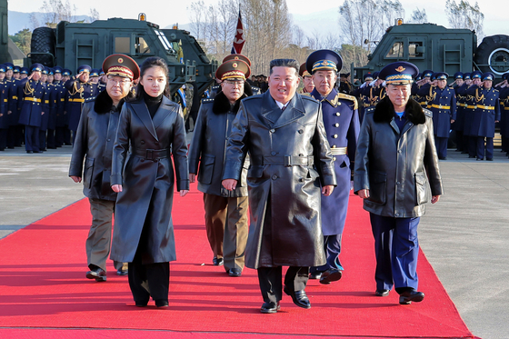 North Korean leader Kim Jong-un, center, and his daughter Ju-ae, to his left, attend a ceremony marking the 80th anniversary of the establishment of the Air Force of the Korean People’s Army at the Kalma Airport of the 59th Kil Yong Jo Hero Regiment of the 2nd Air Division on Nov. 28. [YONHAP]