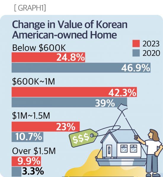 The rising value of Korean-American-owned homes is also evident in the Home Value Survey. In 2020, nearly half of respondents (46.9%) said their home was worth less than $600,000, but by 2023, that number had dropped to nearly half (24.8%). On the other hand, the percentage of respondents who said their home was worth $1 million or more increased significantly. The percentage of homes valued between $1 million and $1.5 million more than doubled from 10.7% in 2020 to 23.0% in 2023, and the percentage of homes valued at $1.5 million or more tripled from 3.3% in 2020 to 9.9% in 2023.
