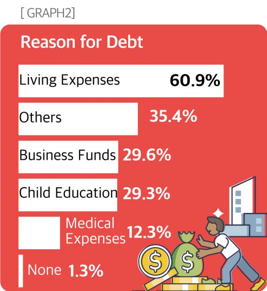 More than half of respondents or 52.5% were in debt. The main reasons for debt were to cover living expenses (60.9%), to finance a business (29.6%), and to pay for children’s education (29.6%). The high percentage of Korean Americans who took on debt for living expenses even as their income level increased shows that even high-income earners are struggling with high prices and the economic downturn. This is not just a problem in the Korean American community. In early 2023, Lending Club found that more than half (51%) of high-income earners earning $100,000 or more per year said they were living paycheck-to-paycheck. That’s up nine percentage points from 42% the year before.