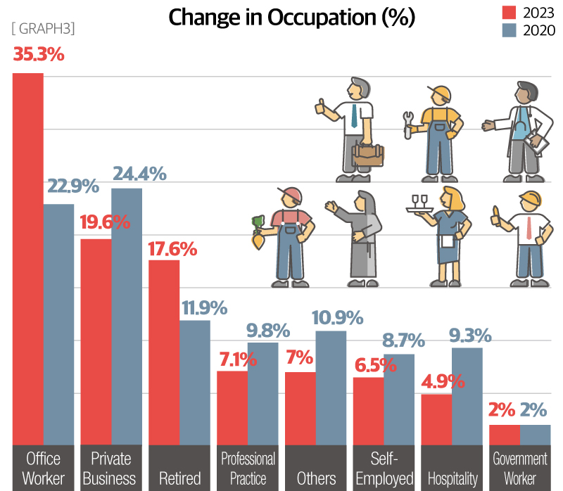 The proportion of retirees and office workers increased significantly, while the proportion of private businesses decreased. The proportion of retirees jumped from 3.2% in 2012 to 11.9% in 2020, and then to 17.6% in just three years. For the first time, the share of private businesses fell below 20%, at 19.6%, after hovering in the low-to-mid 20% range for five surveys since 2006. The trend of having fewer business owners and more retirees coincides with the retirement of many first-generation immigrants who built their economic foundations on running a business.