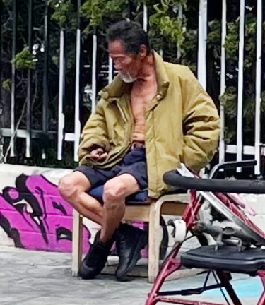 His body is bony. He’s not dressed properly. His speech is gibberish. It apparently shows how devastated his life on the streets is.