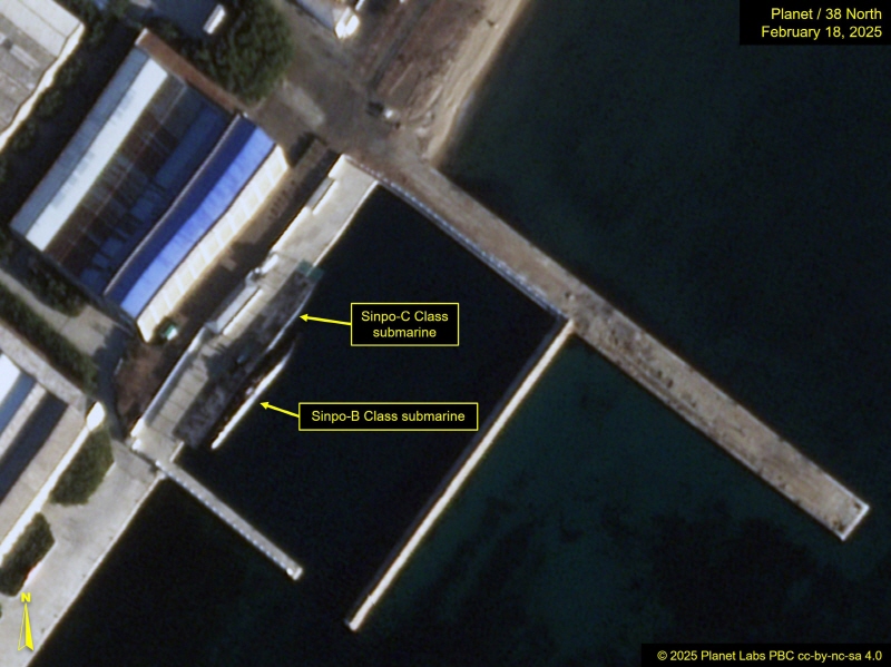 A satellite image from February 18 shows the dry dock empty, with the Hero Kim Kun Ok now moored at a dock within the shipyard. The stern section of the submarine is partially visible under a canopy. A Sinpo-B class submarine is also moored alongside the Hero Kim Kun-ok.