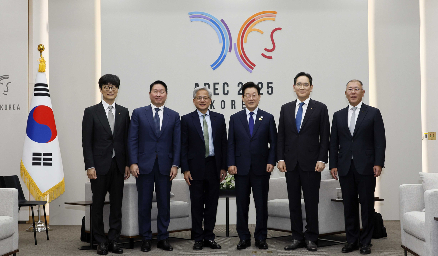 The following day, Huang traveled to Gyeongju, North Gyeongsang, to attend the summit where he joined not only Samsung’s Lee and Hyundai Motor’s Chung once again, but also Korean President Lee Jae Myung, SK Group Chairman Chey Tae-won and Naver founder Lee Hae-jin for a commemorative ceremony marking the GPU supply deal.