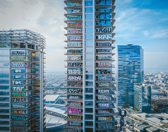The graffiti-covered, long-stalled Oceanwide Plaza site in downtown Los Angeles is facing a possible change in ownership through a federal bankruptcy court process, with the Oceanwide Plaza sale moving forward only if no higher offers emerge by April 9.