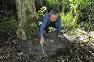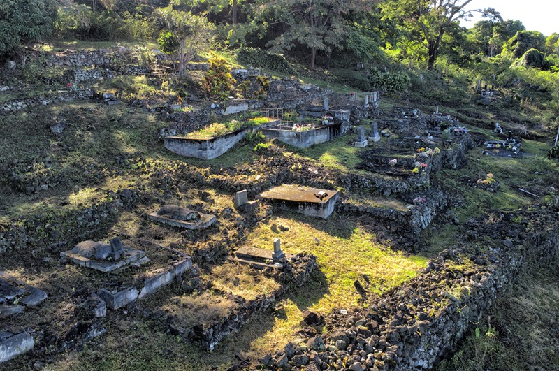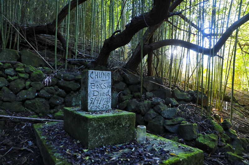 Near a small coffee plantation on the slopes of Hualālai Mountain in Hawaii, a winding path with steep and mossy rocks leads downward. Bamboos stand high, and square-shaped monuments blanketed in aged moss and dust are obscured within a bamboo forest. Upon closer look, hardly readable characters are etched onto these stones.