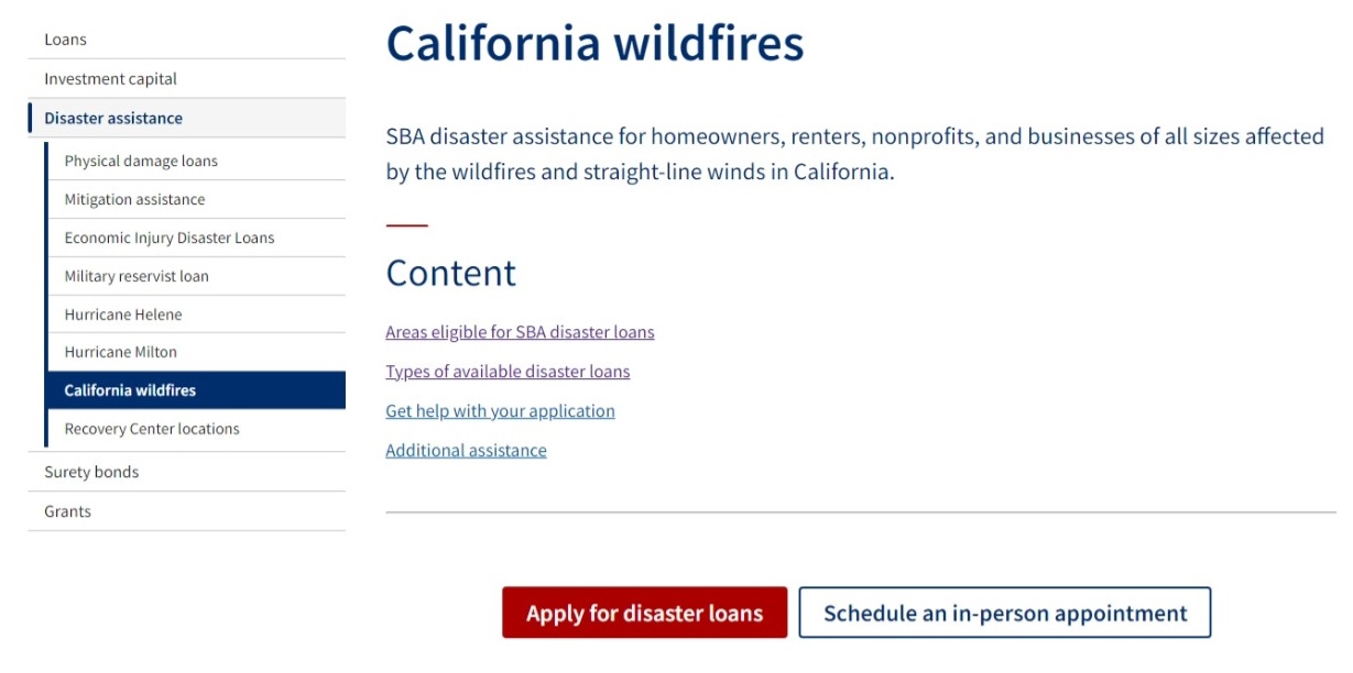 Small businesses that have suffered economic losses due to wildfires may apply for Economic Injury Disaster Loans (EIDL). These loans are available to small businesses, agricultural cooperatives, and most private non-profits in disaster-designated areas. Applicants must demonstrate they are unable to secure credit from other financial institutions.