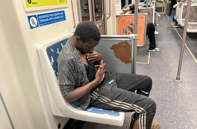 The subway is a lawless place. There are also people who inject drugs. The man injected something into his chest pocket. In his hand, he had a lighter and a rolled-up silver foil.