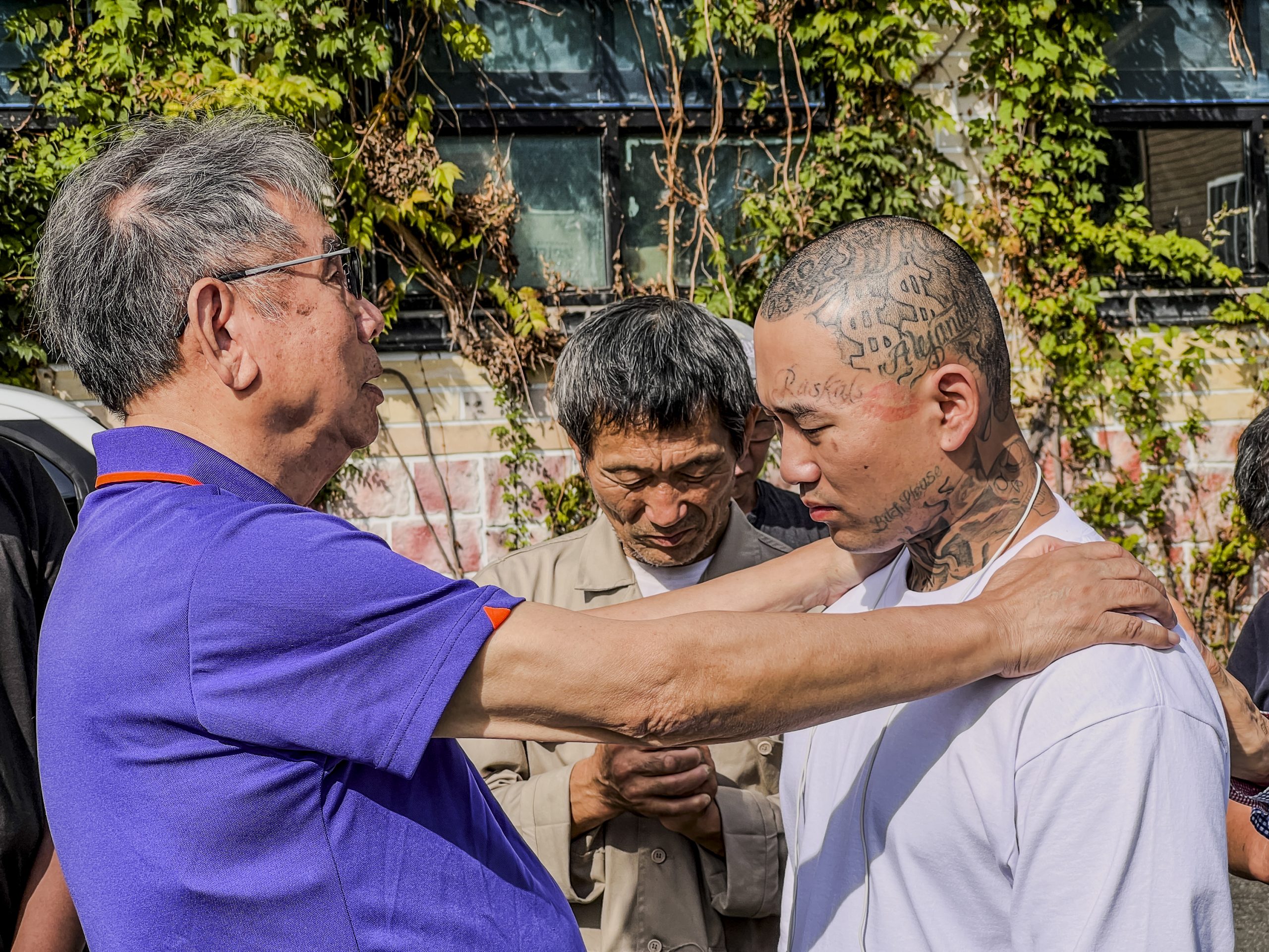 Pastor Ahn Il-kwon and shelter residents pray for K.Y. before military enlistment