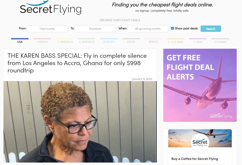 A flight deal parodying LA Mayor Karen Bass’s trip to Ghana has sparked interest. The flight deal website Secret Flying introduced a $998 round-trip ticket from Los Angeles to Accra, the capital of Ghana, under the name “The Karen Bass Special: A Perfectly Silent Flight.”