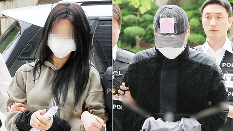 A woman surnamed Yang facing blackmail charges for trying to extort money from Son Heung-min, left, and a man surnamed Yong appear for a pretrial detention hearing at the Seoul Central District Court in southern Seoul on May 17. [YONHAP]