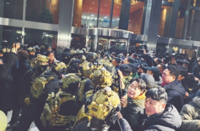 As news of the martial law spread, hundreds of citizens gathered outside the National Assembly to protest the decree. Around 280 soldiers, identified as martial law forces, descended on the parliamentary compound via helicopter, facing strong resistance from citizens and parliamentary aides who barricaded the entrances to the Assembly’s main chamber. The soldiers were reportedly under orders to arrest lawmakers, but resistance from the public and lawmakers’ aides stalled the operation. Some lawmakers, including those from the opposition and even members of Yoon’s own People Power Party, scaled walls and slipped through crowds to enter the chamber.
