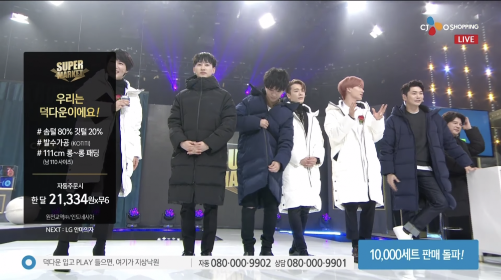 Leeteuk led the show as the main host, while rest of the members communicated with the viewers by answering real-time questions, while also modeling for the product themselves. Men’s black padding coats, which member Shindong demonstrated perfectly, sold out in half an hour.