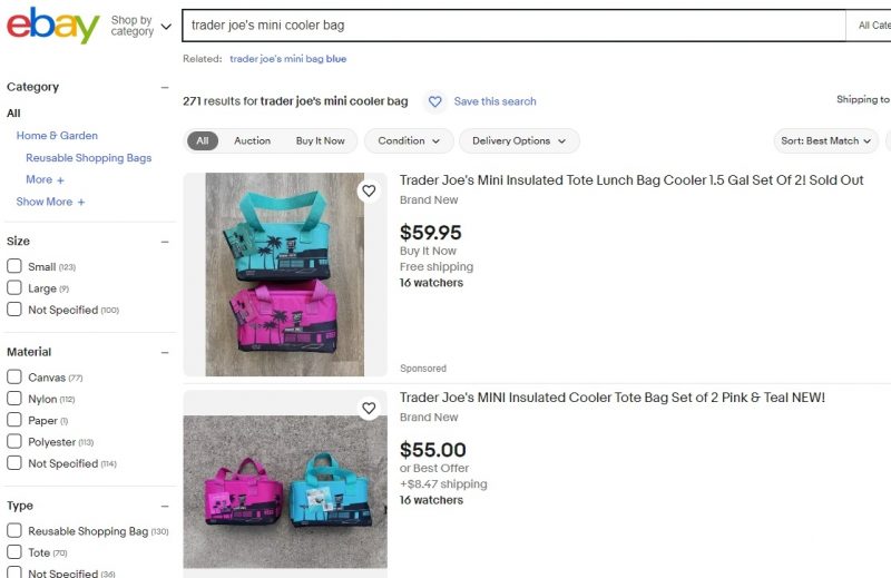 On eBay, a set of two Trader Joe’s cooler bags is listed at $59.95, and they are generally priced between $40 and $50. A single bag is priced between $25 and $30, nearly ten times the original price.