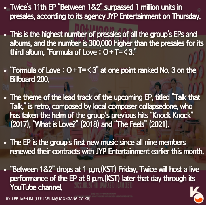 Twice’s upcoming EP ‘Between1&2’ passes 1 million in presales By Korea Daily Digital Aug 25, 2022 1:14 PM PDT #Twice #Between1and2 #JYPEntertainment #FolmulaofLove #Billboard200 #TalkthatTalk #KnockKnock #WhatisLove #TheFeels #kpop #kdrama #kmovie #korean #koreanamerican #love #kpopdance #kpopnews #katchup #katchupofficial #케이팝 #케치업 #케치업오피셜 Share FacebookXPinterestWhatsApp Chargeback Fraud Cases Surge in LA Koreatown Dining Mar 19, 2026 3:27 PM PDT Breaking Silence: Kim Jung-min Reveals Shocking Truth of $1M Lawsuit Mar 19, 2026 3:20 PM PDT MacArthur Park’s New Icon: 55-Story Centro Westlake LA Approved Mar 19, 2026 3:16 PM PDT Is the Free Ride Over? New $250 EV Fee Proposed Mar 19, 2026 3:11 PM PDT Load more