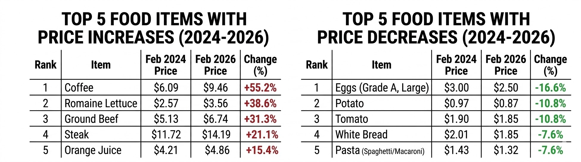 Navigating the supermarket aisles in 2026 feels like a high-stakes game of “Guess the Price Tag.” While the overall US Grocery Prices 2026 data shows a cooling trend for some pantry staples, your morning caffeine fix might just be the most expensive part of your day. A recent analysis by CouponFollow, based on Bureau of Labor Statistics (BLS) data from February 2024 to February 2026, reveals a stark divide: 11 out of 25 major food items have dropped in price, yet the “big ticket” items are still burning holes in wallets.