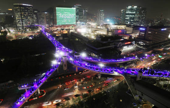 The highlight of a visit to Seoullo 7017 makes its appearance when the sun is gone. When it gets dark, the gigantic “Shoes Tree” and petite botanical gardens yield their places to blue lights. 111 light poles and 551 floor lamps emit blue light to create a special mood.