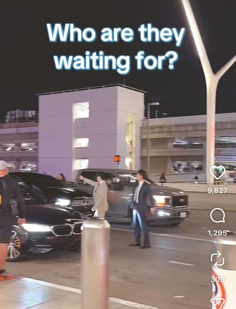 Men in suits are directing traffic on the roadway in front of the Tom Bradley International Terminal at Los Angeles International Airport. Rev. Younghoon Lee is stepping out of a stopped vehicle. [Instagram capture from @joy.of.everything]